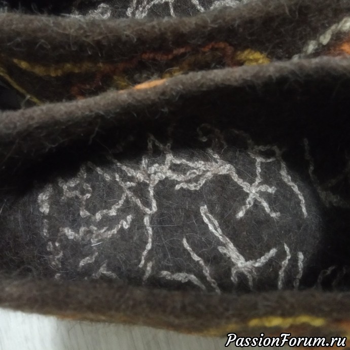 Тапочки из некрашенного бергшафа, декор пряжа, желтая и молочная 100% шерсть, рыжая скорее всего акрил. Внутри слой неизвестного топса(даже не помню когда его покупала) декор из пряжи шелк+хлопок.