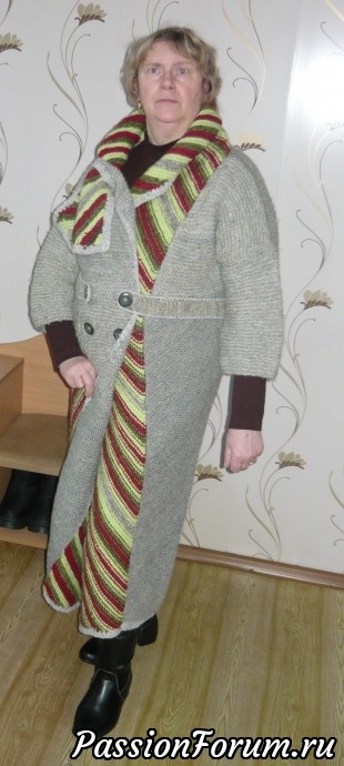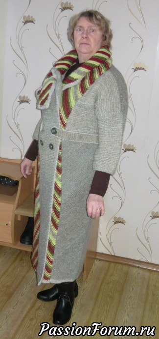 Добрый день, дорогие рукодельницы! Морозы так и не спадают. теперь уже перевалило за -32! Ну, что ж, надо утепляться! Выношу на ваш суд и обозрение вязаное пальто. Нитки для вязания использовала чистошерстяные, цветные полосы - акрил. Пальто получилось толстое и тёплое, правда, полнит очень. Попросила фотографировать своего благоверного, долго упрашивала, наконец-то, свершилось и вот что из этого получилось!