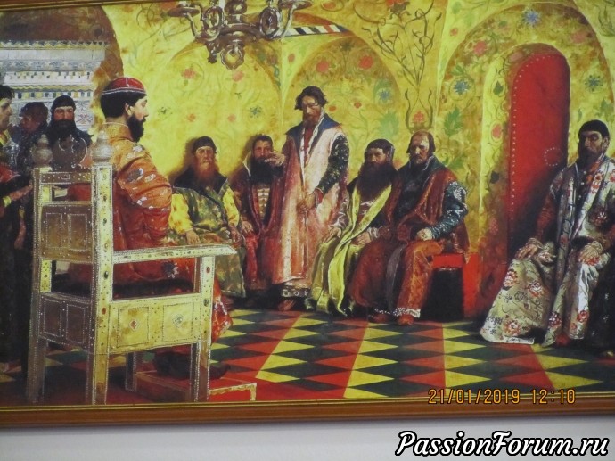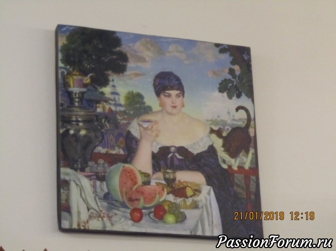 Если посмотреть от входа, то полностью воссоздается картина и кот как будто трется о плечо хозяйки.На самом деле он нарисован на стене