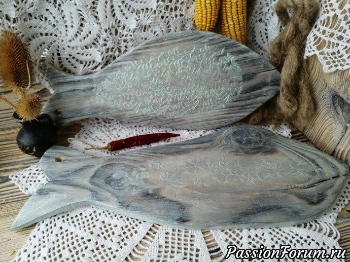 А вот досочки-это вообще анекдот!!! Они действительно найдены в дровяных отходах. Сама рисовала рыбок на доске и сама вырезала торцовочной пилой. Вот глаз так запал в дущу, что даже не посмотрела что доска горбыль…