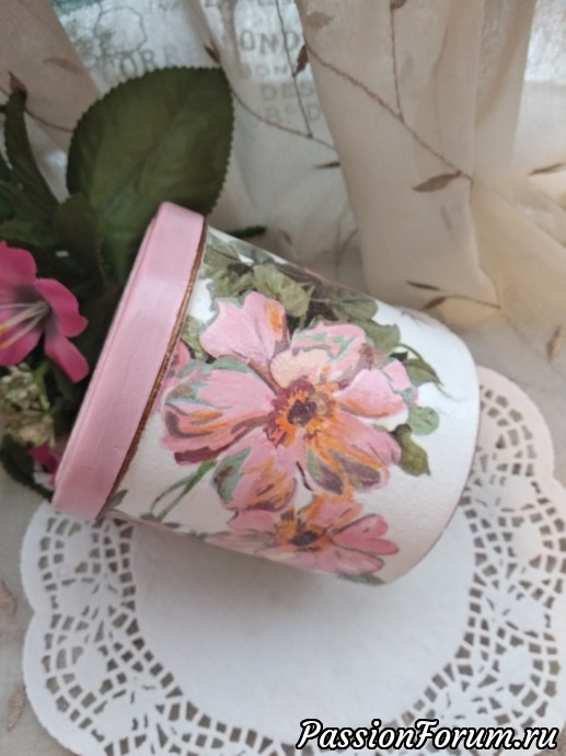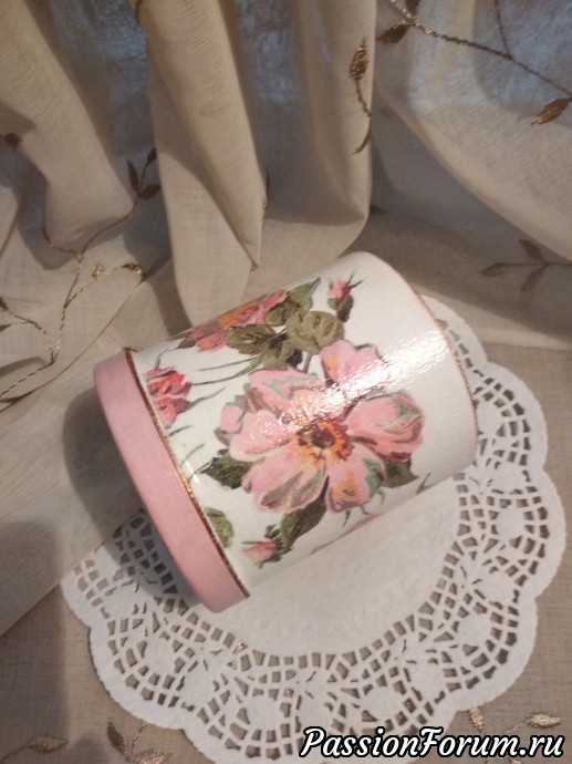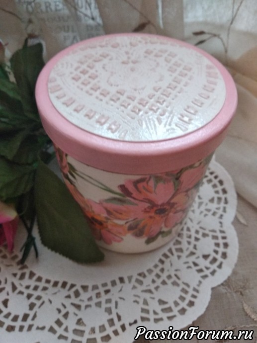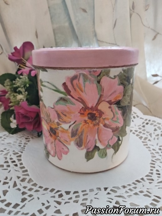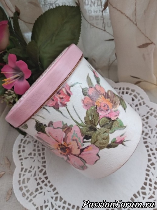 Приступаю потихоньку к новым работам, хочется поработать с заготовками, которые уже давно купила..., немного упражняюсь в витражной росписи... НО, меня тянут недоделки, я люблю все доводить начатое до конца!!! Поэтому, я сегодня к вам со своей доделкой, баночкой под названием "Шиповник", начала ее делать еще на даче, вроде все складывалось хорошо, но я решила сделать двухшаговый кракелюр, и тут случился провал, получила не то что хотела, начала смывать и смыла все до основания, осталась нетронутой только крышка, пришлось делать заново, подбирала вариант уже под крышку..., когда приложила салфетку с шиповником поняла, это то что нужно, как буд-то там и была... Этот вариант меня даже устроил лучше, чем прежний... Значит все было к лучшему!!! В качестве трафарета на крышке использовала салфетку ПВХ, работала шпаклевкой!!! Баночку буду использовать под морскую соль для ванной...