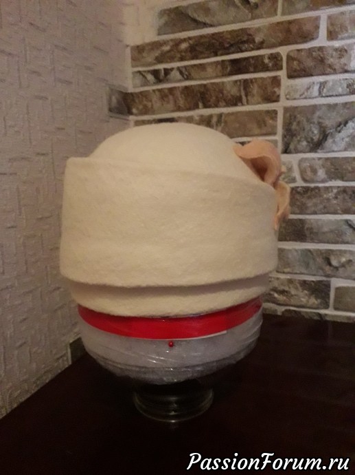 Вот на фото ободочек получился за счет двух глубоких складок по кругу головы — вверху и внизу. Беру подходящего размера валяное полотно (можно пробники использовать) и вставляю его верхним краем в верхнюю складку и нижним краем в нижнюю складку. Складка становится объемнее и прочнее. С изнанки пришиваю торчащую внутрь складку к этой вставке, чтобы не смещалось. Потом пришиваю все украшения и в завершении пришиваю подклад. Изнутри получается всё ровно и красиво!