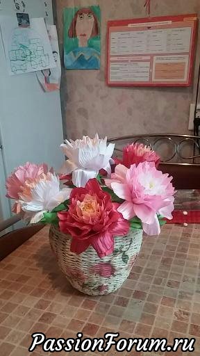 Продолжаю выкладывать свои старые фото. Года два назад делали с детьми к 8 марта вот такой букет. Пионы сделаны из шелковых лент, ваза из газетных трубочек.