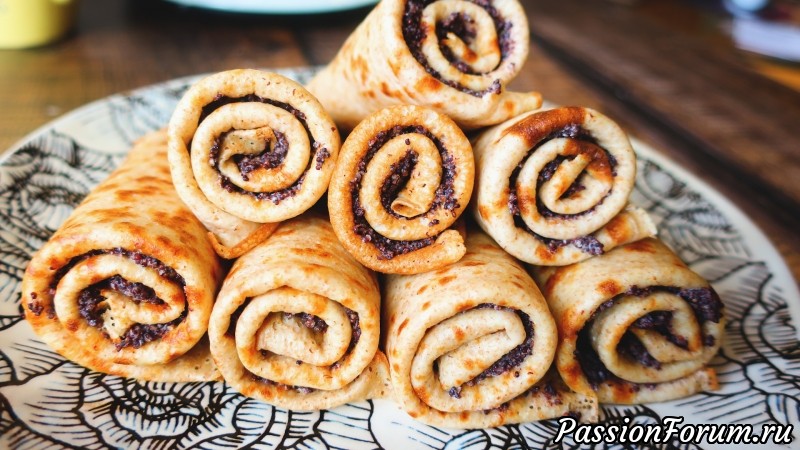 4. Сворачиваем блинчик пополам, начинку делим на 8 частей, и равномерно распределяем по каждому блинчику, сворачиваем рулетиком.