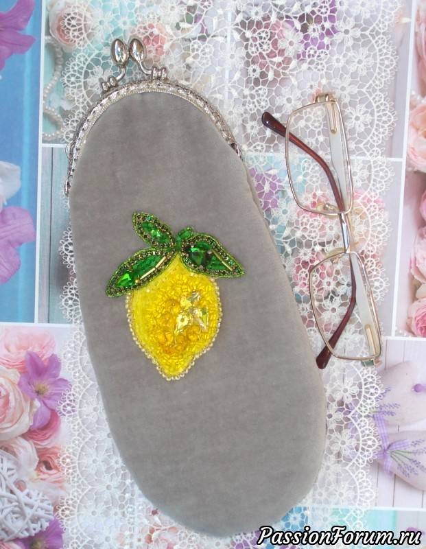3) Очечник «Лимончик» сшит из итальянского бархата благородного серого цвета, украшен вышивкой чешским бисером, стеклянными стразами, золотистой канителью, стеклянными бусинами. Укреплен поролоном. Внутри - подкладочная ткань. Фермуар серебристый размером 8,5см.