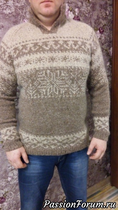 И снова добрый день...))) , дорогие девочки-форумчанки ). Я хочу показать Вам связанный в конце 2018 г свитер моему милому ))) Свитер связан из тонких шерстяных ниточек, которые я покупала у нас на форуме у Нины (chalou ). Соединила 3 ниточки, добавила ниточку кид -мохера для легкой пушистости и вперед..Милый у меня мужчина крупный, рост 190 и 60 размер... было немного страшновато , но вроде получилось неплохо... ( для сравнения показываю фото на мне - просто туника))))) Это у меня 4 свитер -жаккард ( прошлые в моих топика ), такой скромный получился, но яркий он не захотел ... Свитер получился очень теплый, и поэтому муж одевает его редко , но моей работой доволен!! Ниточки мне очень понравились, мягкие, теплые, примеряла свитер после стирки в шампуне и бальзаме на голое тело - не колятся!!! Рекомендую!!! Вязала, как описала ранее - реглан снизу... Рукава получились длинноваты, и я их укорачивала хитренько так, на фотке поверх узора поперечная полоска)))) И по низу прошлась такой полоской, что б в глаза не бросалось... Воротничок - стоечка , резинка 1*1 и патентная.