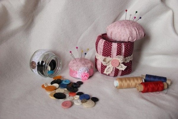 У каждой рукодельницы найдется маленькая стеклянная баночка. Из нее можно сделать вот такую милую игольницу.