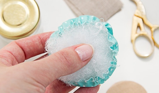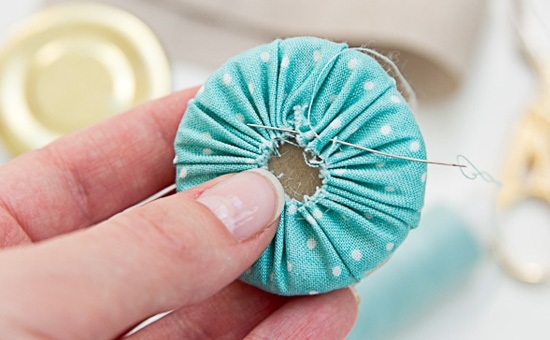 3. Вырезаем картонный круг, равный диаметру крышки, кладем его внутрь ткани с синтепоном и плотно стягиваем нитку.