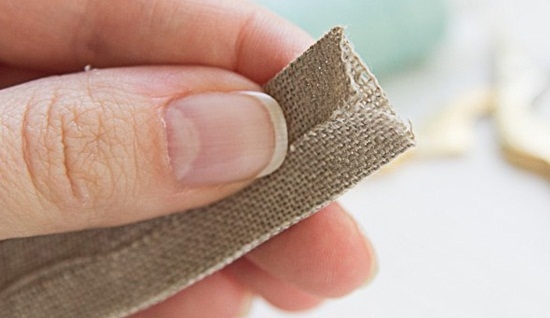5. Вырезаем из другой ткани полоски, в 2 раза больше ширины крышки, загибаем края ткани, чтобы нитки не вытрёпывались, разглаживаем полоски утюгом и приклеиваем их к бортикам крышки.