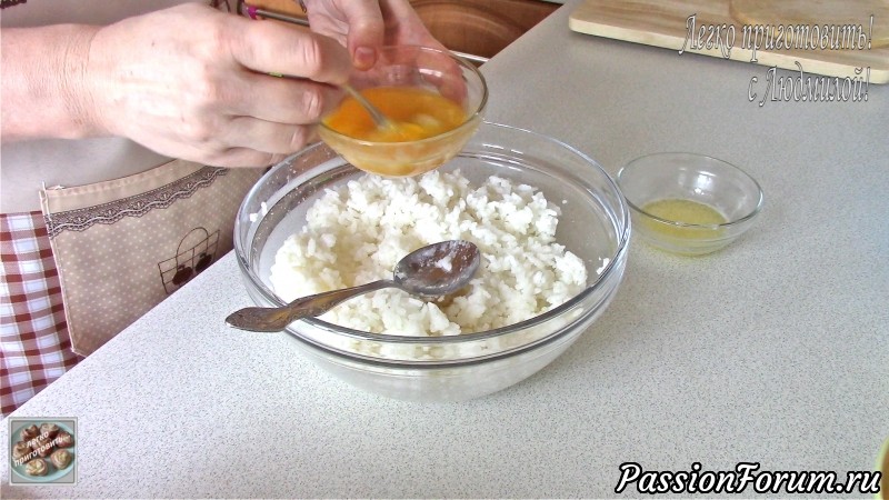 Когда с риса стекла вся вода, перекладываю его в отдельную миску, добавляю к нему куриные яйца и остывшее растопленное сливочное масло. Все тщательно перемешиваю.