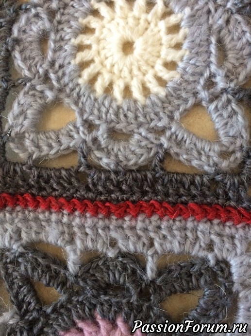 У меня красной ниточки, которой я обвязывала, осталось 48 см, темно-серой даже чуть-чуть не хватило. Пришлось распускать в одном месте обвязку и менять один мотив. Вязать другим цветом. Вот так. Конечно, нехватка ниток очень напрягает.