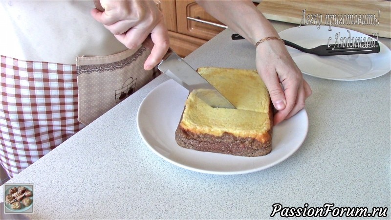 Когда запеканка немного остынет, накрываю форму подходящей по размеру тарелкой и аккуратно ее переворачиваю, чтобы запеканка оказалась на тарелке. Так она выглядит гораздо симпатичнее, чем в форме. Форму убираю, а запеканку нарезаю на порционные куски.