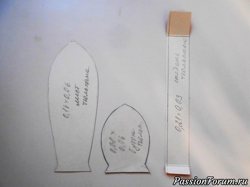 Сделала выкройку для удобства: первый лист ширина 6 см. и длина 16 см.- 2 детали, второй бутон цветка ширина 6 см. и длина 8 см.