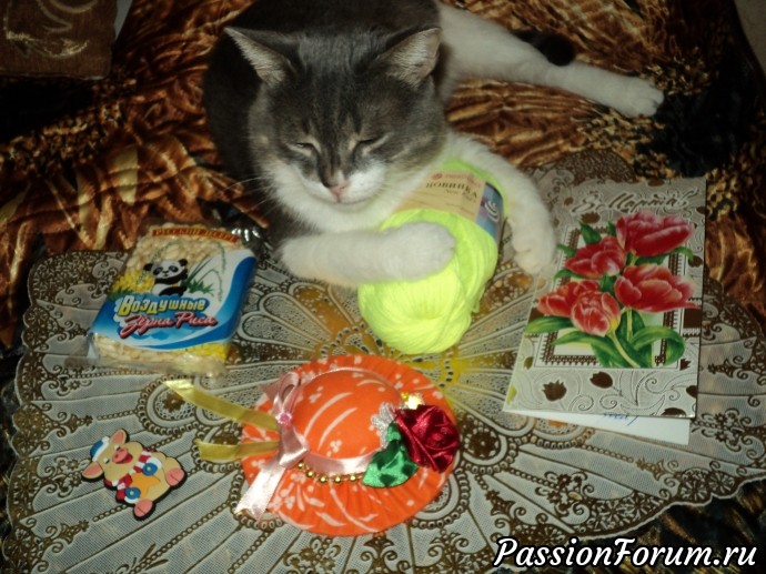 Ирочка, очень рада, что понравился сюрприз, всегда волнительный момент. Я поздравляю еще раз с весной. И жду воплощение клубочка в жизнь! Котейке я вижу пряжа тоже по душе пришлась.