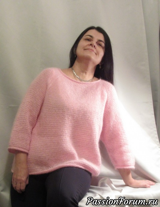 Вдохновлялась работами О. Кондратьевой. Свитер связан регланом сверху,росток вывязывала,как в ролике О.К. на ютуб-е- сзади,на спинке,на уровне разделения полотна на тушку и рукава. Получилось незаметно,но мне не понравилось. Я сутулюсь, и такое легкое изделие благополучно переползает сзади наперед,вздергивается. Вязала под себя- не очень широко,но и в облипку не хотела. Не понравились рукава,но распускать- вы же понимаете- мохер- по мне лучше новый связать. Мохер "Камтекс",на хлопке, мне понравился цвет. И не колючий. Но сыпется довольно сильно, придется думать- с чем носить буду. Вес изделия 196 гр. Вязала в одну нить с добавлением "Лидии" Семеновской полушерсть. Результатом в общем то довольна, если не считать мелочей.