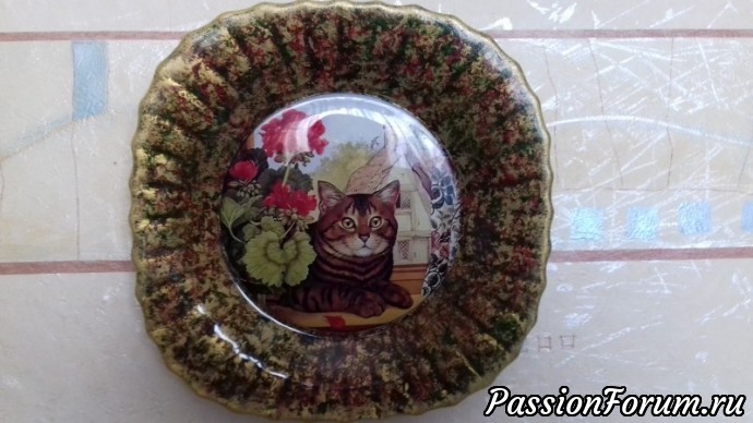 Обратный декупаж, распечатка на фотобумаге, акриловые краски для фона, клей, лак, золочение.Тарелку можно поставить на подставку а можно повесить на стену.