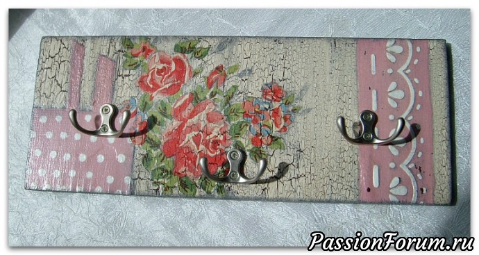 Ключница сделана из фанеры №10.Грунтовка, шкурение.1-ый слой краска коричневая.Кракелюр одношаговый.Декупаж салфеткой, подрисовка, объёмные узоры справа-шпаклёвка через трафарет.Лак сначала глянцевый, в конце 2 слоя матовый.
