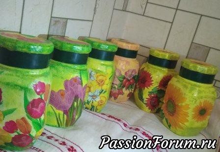 Плясала от крышечек, которые для практичности решила не декупажить. Декупаж салфетками, подрисовка фона. акриловый лак.