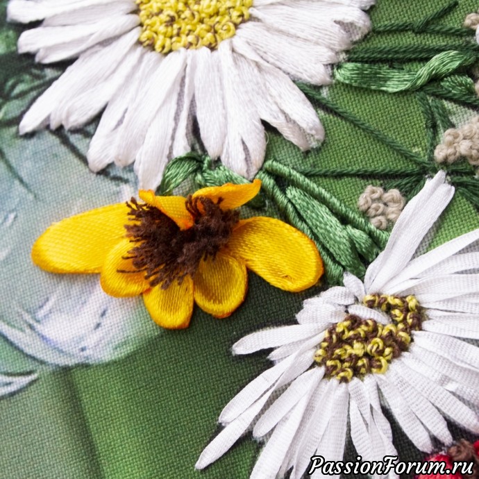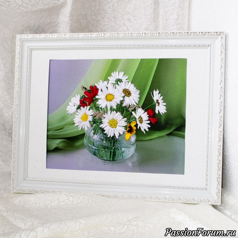 Давненько я не выставляла здесь свои работы, какой то зимный сон наверно или еще что. Вот посмотрела работы коллег и решила показать свои ромашки, уже столько их было, этот раз вышила атласными лентами и лентами искусственного шелка, даже сделала цветочек с отлетными лепестками, а вообще больше люблю именно вышивку лентами, а не аппликации, которые тоже называют вышивкой. Но это дело вкуса, фантазии, вдохновения и желания выразить свой взгляд на ту или иную картину и работу. Всем творческого весеннего настроения и много прекрасных работ.