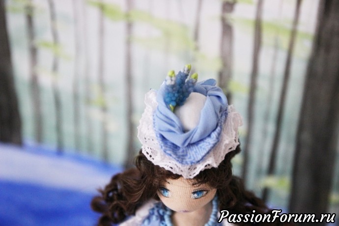 Наряд куклы нежно-голубого цвета выполнен в стиле Викторианской эпохи. Шляпка украшена миниатюрными цветами - мускари.