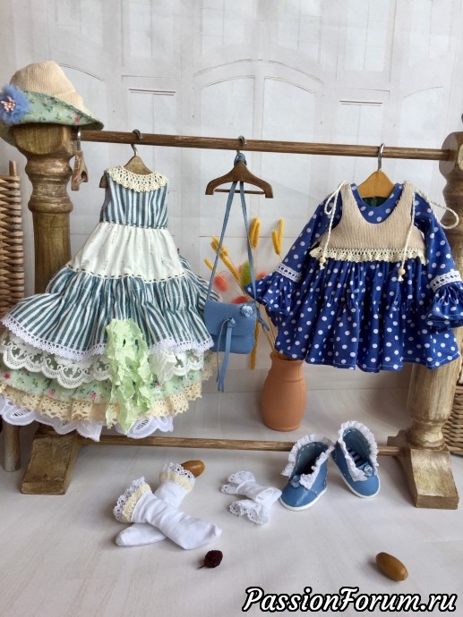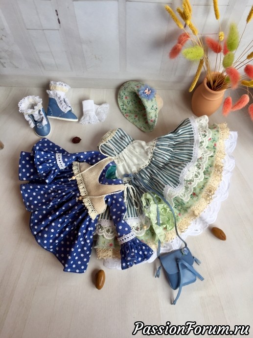 Комплект одежды для куклы ростом 50 см. Выполнен из хлопка. Обувь и сумочка из натуральной кожи.