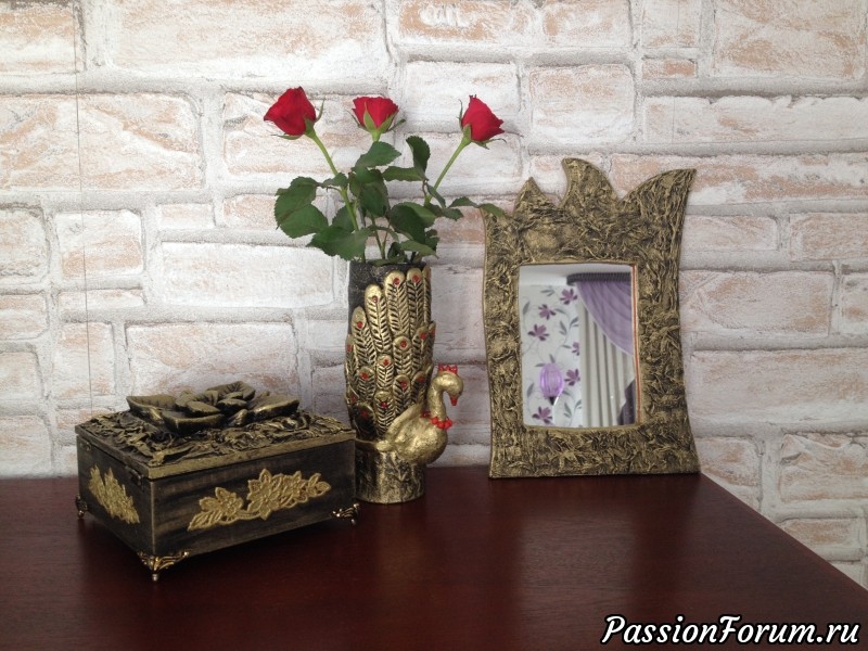 Зеркало если пойдет в комплекте со шкатулкой то может добавить цветов букетиком на нижний уголок-где побольше места-в такой же тонировке.