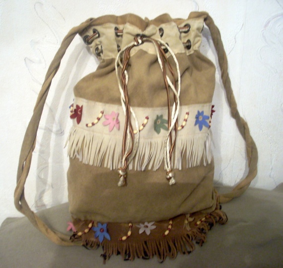 Как видите, все очень просто. Основных цвета два (это видно на ручке), а вверху с дырочками, посередине и внизу с бусинами и бахромой — это готовая тесьма. Отдельно куплены шнуры подходящих цветов и вдеты в верхнюю тесьму после пришивания. Затягиваем их — сумка закрыта, раздвигаем — открыта. Носила ее на длинной ручке через левое плечо на правом бедре, а потом пришила к дну сумки ручку посередине и получился рюкзачок, который ношу сейчас на одном плече. Внутри подкладка с одним карманом для телефона. Ей уже столько лет, а я ее люблю))).