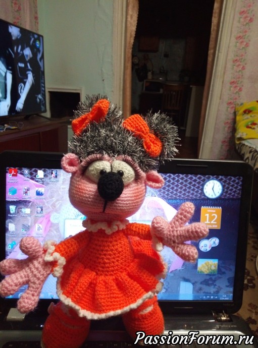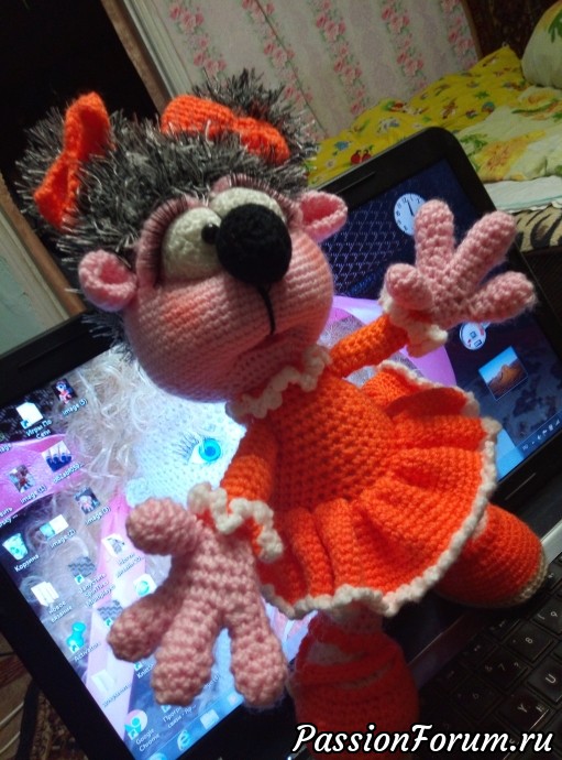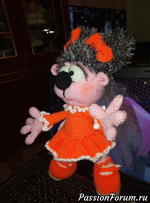 Красотулечка-симпапулечка! как я люблю такие прикольные игрушки, сама связать еще не решусь никак.Смотришь на нее и рот до ушей.Вот такой она несет позитив, радость.