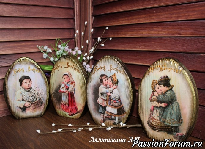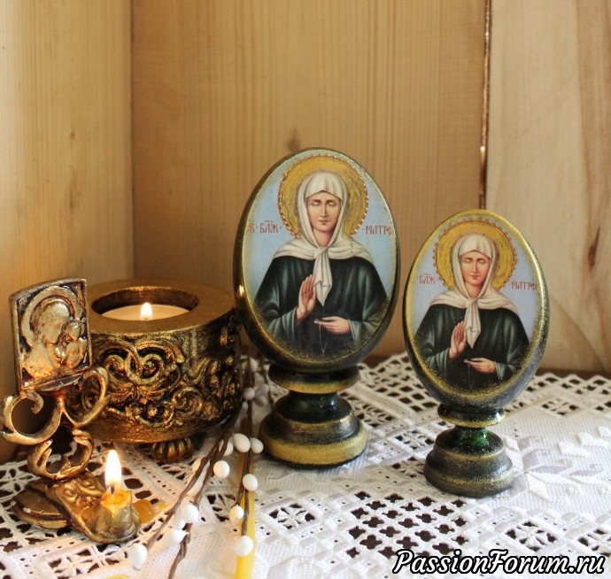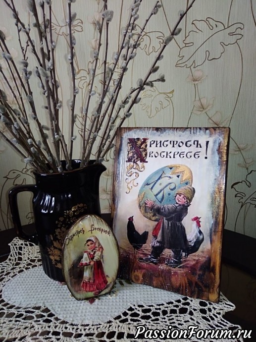 Мой марафон по созданию Пасхальных подарков в самом разгаре. Я сегодня предлагаю Вам, уважаемые форумчанки, вторую подборку приготовленных подарков. Пасхальные интерьерные яйца считала до 65, но потом сбилась. Думаю, что где то в пределах 80 штук я сделала, не считая подсвечников с ликами святых, Богородицы и Господа нашего. Времени у меня в этом году предостаточно: 1,5 месяца на больничном , а потом - месяц отпуска. Погода была плохая, вот и отвела свою душеньку декупажем. Начинаю делать Пасхальные композиции в корзине, в супнице и кофейнике и в пластмассовом ведерке и в торфяном горшочке. Задумок - море! Но в начале хочу показать Вам подарочную шкатулку. Главный мотив- картина на библейские сюжеты художника иконописца Д.Н. Хомякова. Шкатулка . 17,5*16*6см. Здесь вживление основного мотива в светлую золотую поталь, а боковины - в тёмную золотую поталь. Зеркальная лакировка, роспись объёмными контурами, металлическая фурнитура.