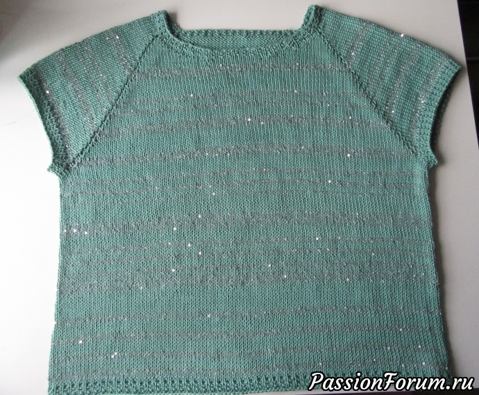 А еще вот у меня что за неделю связалось- вечерами,вечерами,потихоньку. Кофточка из хлопковой пряхи "Альпина" Рене,100 м в 50 гр,и хлопок- вискоза- пайетки ,не помню,от какой фабрики. Всего 400 гр пряжи ,спицы 4.5. Ширина 52 см,длина 54 см,стандартный реглан сверху,подрез 6 см,регланная линия 29 см. Сидит на фигуре отлично- не больше,ни меньше не надо. Реглан вязала по расчету,которым раньше не пользовалась. Я привыкла рассчитывать реглан так- количество петель делить на 3 части- одна часть перед,вторая- спинка, а третью делим пополам для рукавов. Ну,естественно,вычитаем регланные линии,и корректируем для вывязывания ростка перед- спинку. А вот тут я рассчитала по другому примеру. Делила на 8 все петли,и 1/8- это петли рукава,а по 3/8- на перед и спинку. Что получилось? Рукава чуть уже,тельце чуть шире. Что мне и надо было,т к при моем привычном способе рукава получались шире,чем мне было надо.