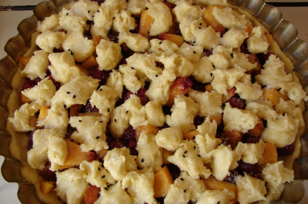 Ягодки выкладываем, посыпаем сахаром. Сливы я порезала на четыре части вдоль. Вторую, меньшую (1/8) часть теста кладем на ягоды произвольными кусочками - "щипаем".