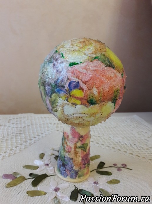 Ножом аккуратно отрезала выступ где привязывантся веревочка, что бы вешать на елку и приклеила на подставку, которую тоже обклеила салфеткой.