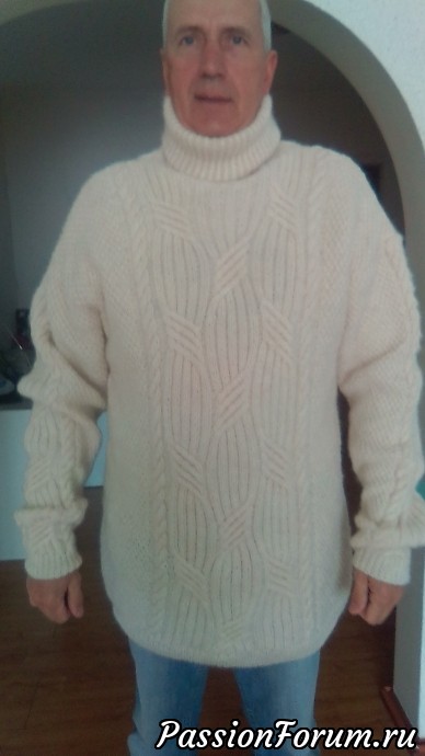 Добры день всем заглянувшим. Везёт мне последнее время на заказы гигантский размеров. То мужчина заказал белый свитер 98 см длиной, ну приезжайте, говорю мерки снять надо. Приехал: 2м ростом, 54размер. 2 кг чистой овечьей шерсти ушло. Ещё его не закончила, женщина заказывает жилет 58 размера с козьего пуха. Почти 1800 ушло чистого веса. А на подходе ещё один заказ: пальто с Аранами 52 размера до колена. Ох, а сколько своих хотелок ещё лежит.