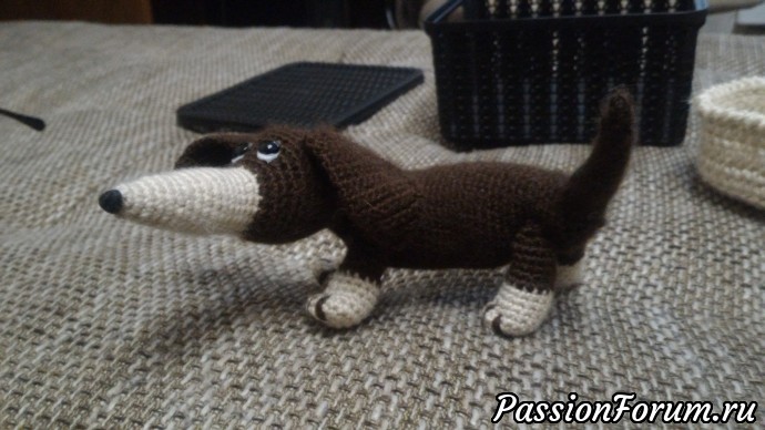 У моей сестренки недавно случился юбилей. Она фанатка собачек породы такса. Так и родилась идея для подарка. Игрушка связана по МК Ольги Цепелевой.