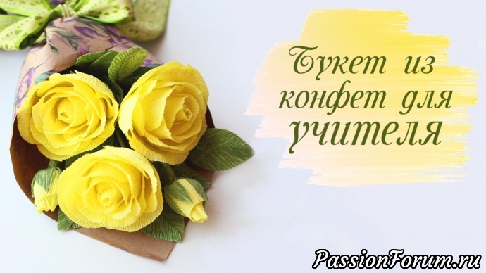 А я покажу как сделать простой букет-комплимент для учителя с розами и шоколадными конфетками.