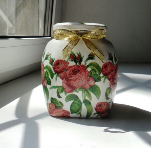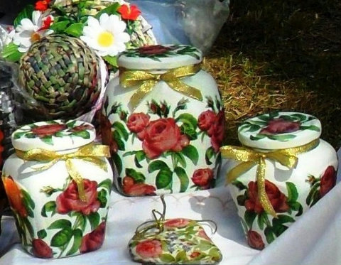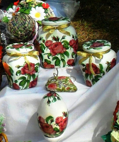 Всё, кроме баночек, выполнено из бумаги в технике папье-маше. Грунтовка - строительная шпатлёвка, покрытие - акриловый лак по дереву в несколько слоёв (10-13). Буду рада прочитать все комментарии и замечания по поводу моих работ. Спасибо всем, кто заглянул на мою страничку.