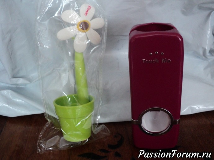 А это цветочек-ручка.А это что за зверь?Сверху дырка и сбоку тоже?Долго я его крутила-вертела,а потом додумалась залезть в интернет и нашла этот прибор.Оказывается это дозатор для зубной пасты, сверху вставляется тюбик,внизу в отверстие зубная щетка и из тюбика снизу выливается паста.Все крепится на стенку.Можно крем для рук или еще что-нибудь вставить.