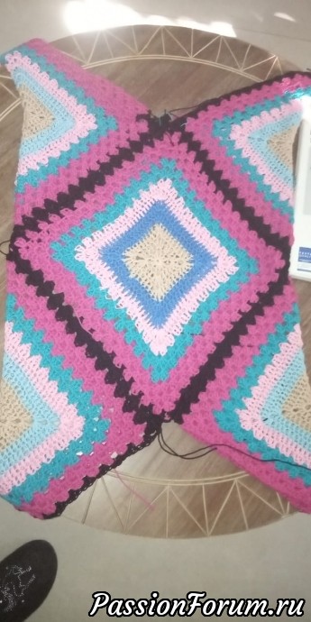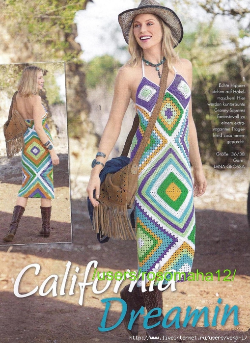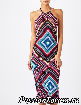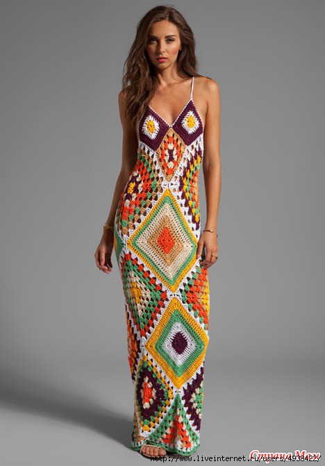 Вы хотели бы точно такое платье, как на фото? Если Вам нужен именно такой же фасон, один в один, тогда обратите внимание: каждый квадрат огромен, середина каждого обвязана еще 4-мя рядами разных цветов. Мне Ваши квадраты показались маленькими, но это может быть только иллюзия. В общем, я набросала примерную схему сборки спины и переда. Для получения срезов верхние квадраты с определенного места начинаете вязать поворотными рядами ( а не по кругу), обвязывая каждый столько, сколько надо.