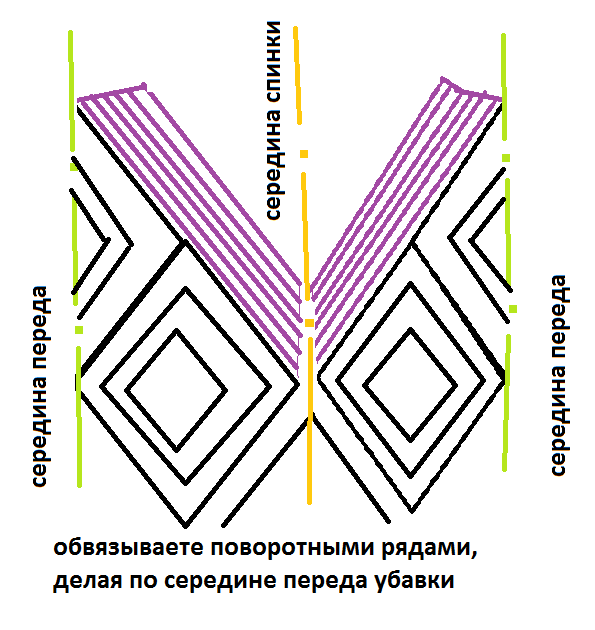 Красным отметила места, с которых надо начинать вязать поворотными рядами; зеленым — сколько надо связать поворотных рядов до соединения квадратов, голубым — сколько надвязываете короткими рядами, чтобы плавно соединилась спинка с передом.