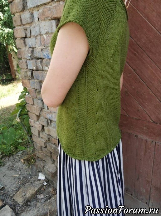 Здравствуйте, воспользовалась тем что меня сфотографировали, ну и как тут не показать свою работу. Мой объём 80, на св обл прибавила 8 см. Пряжа ярнарт стиль/ 67%-хб, 33%вискоза, 50г- 185 м/ ушло 200 граммов, спицы 2,75. Вязала сверху, без швов. Модель нашла на просторах, но работала не по описанию, а по картинке. Как в этой вещи комфортно при жаре +30.