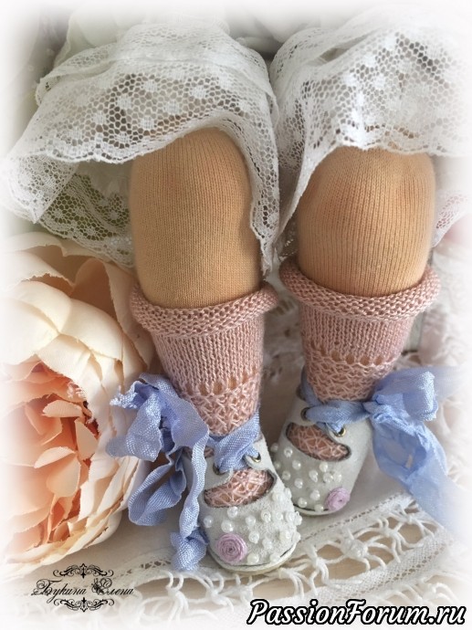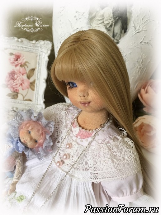 София, коллекционная полностью текстильная куколка. Малышка сшита из хлопка, обтянута трикотажем. Личико у куколки объёмное. Девочка вся подвижная. Головушка крутится и наклоняется. Ручки и ножки крепятся, как у будуарных кукол или куклы-болтушки. Поэтому она умеет красиво сидеть и мило складывать ручки. Пальчики на ручках гнутся, есть маникюр. Волосы искусственные трессы, можно аккуратно менять прическу. У малышки вся одежда съёмная, кроме комбинезона. Одежка сшита из хлопка, марлевки, украшена кружевом, бисером, вышивкой, шебби лентами. Ботиночки сшиты из натуральной итальянской замши… В руках у Софочки маленькая куколка. Рост куколки 39 см.