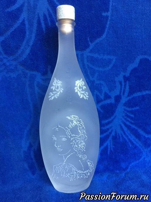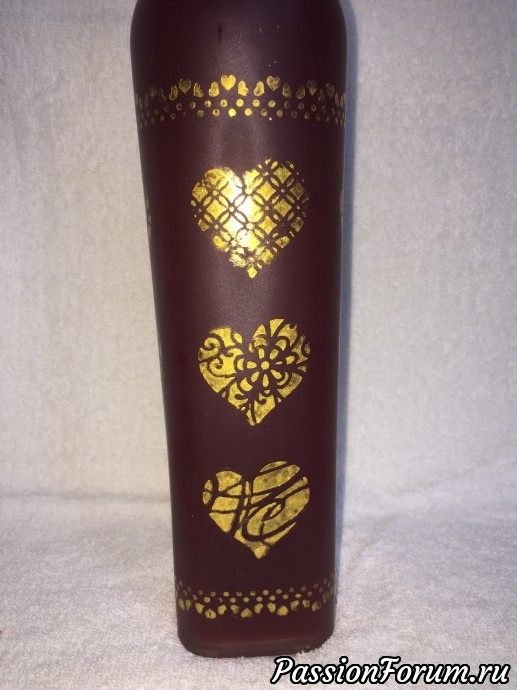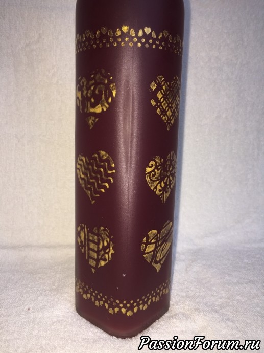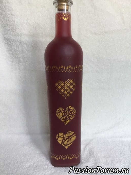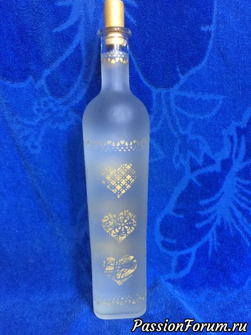 Не успела разделаться с этой проблемой, так принесли ещё одну - бутылку тоже матерно-матовую, но если матовость на первой голубоватая, то на второй - желтоватая, и я её сделала в золотых тонах. Тут не стала особо мудрить, навела состав ЗОЛОТАЯ ПУДРА+ЛАК и через трафареты нанесла на бутылку.