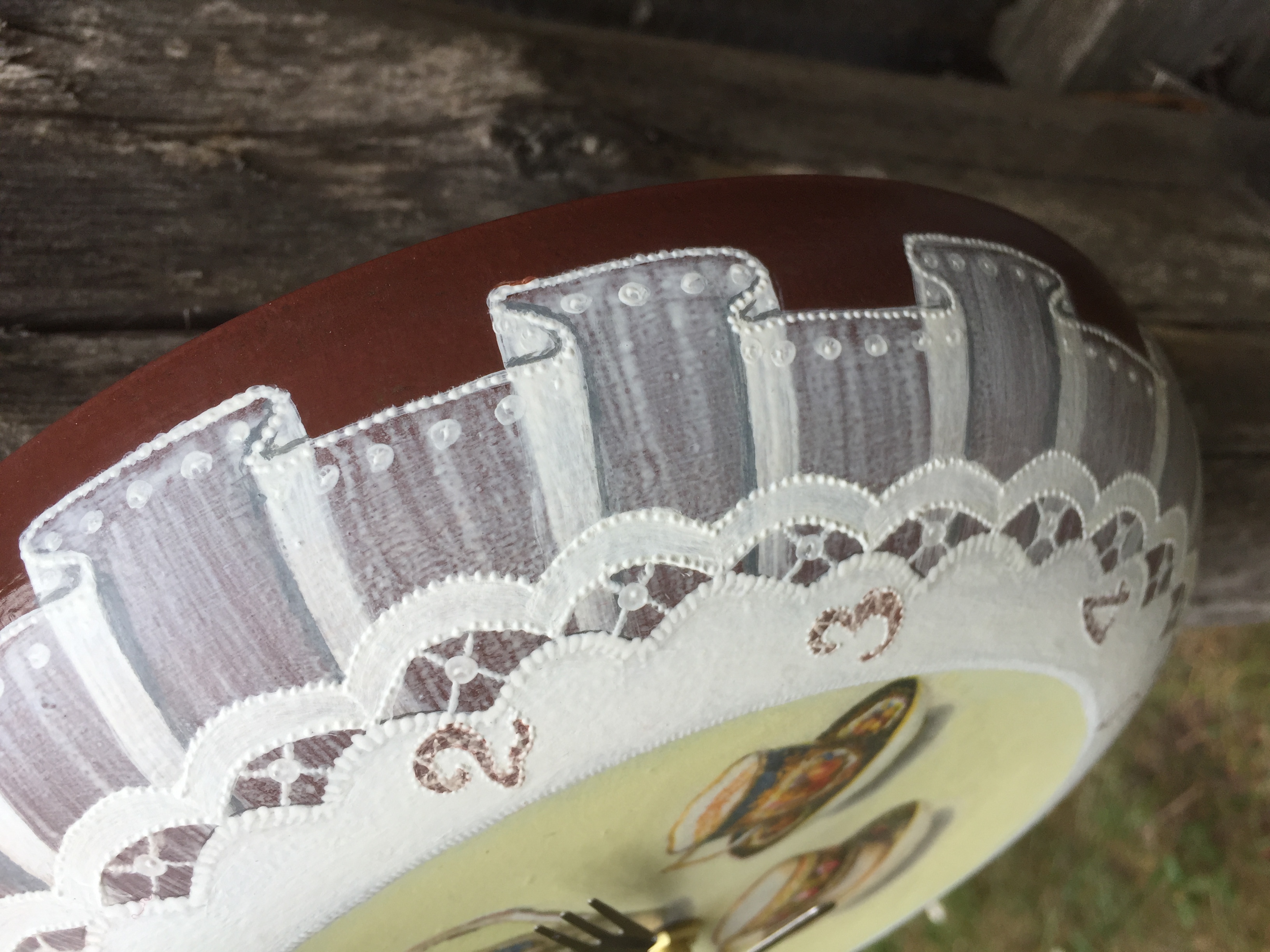 Процесс увлекательный и мне понравилось в нём всё, кроме ложки дёгтя… И так, под конец, решив, что уж делать – так на века, чтоб меня пережило, покрыла лаком-спреем матовым (пошла в сарай этим таинством заниматься – на улице ветер бешеный), принесла домой довольная как слон. Через 5 минут, глядь, а на белой краске проступила коричневая, спасибо не везде, а там, где видно я лака не пожалела. Короче, чего-то процесс химический не туда завернул. До этого покрывала слои в работе акрилатным лаком. Я (100 раз балда), зная, что нежелательно тут винегрет строгать, использовала другой состав лака на «авось» (потому что где-то у меня прокатывало…). Но то ли ещё коричневая краска непонятного состава у меня намешанная стояла (не пропадать же добру), хотя кроме акриловых красок ничего не использую.