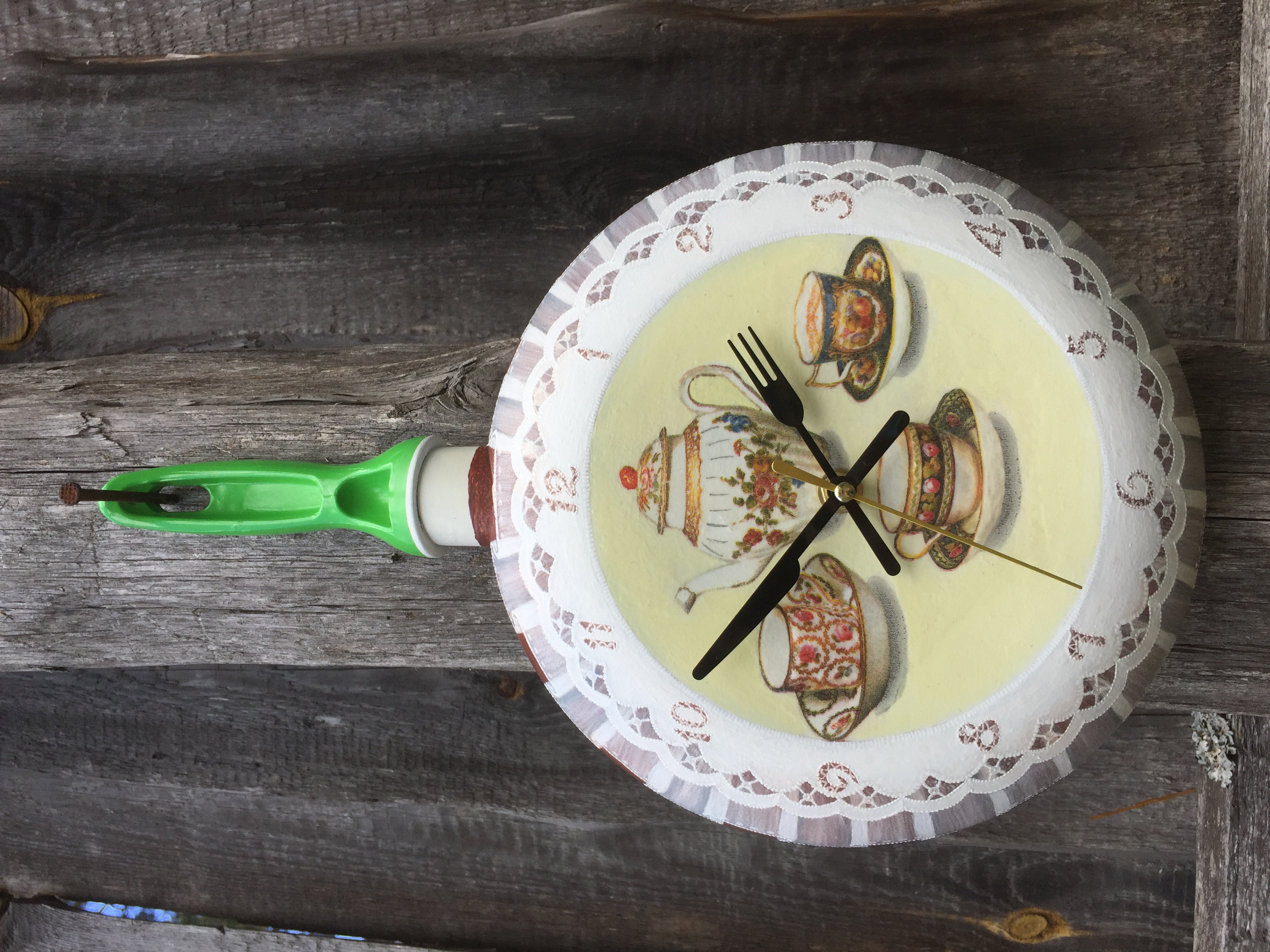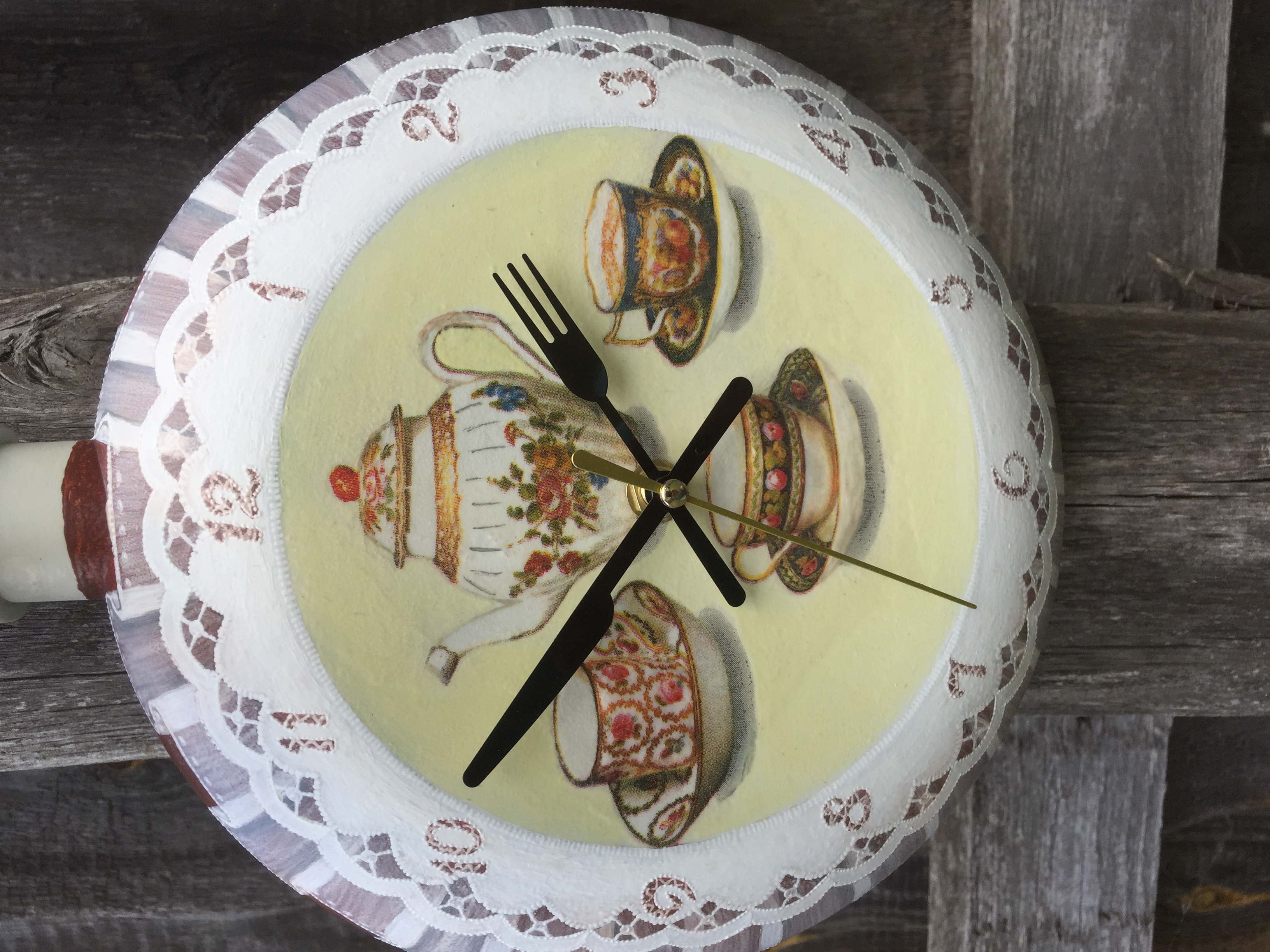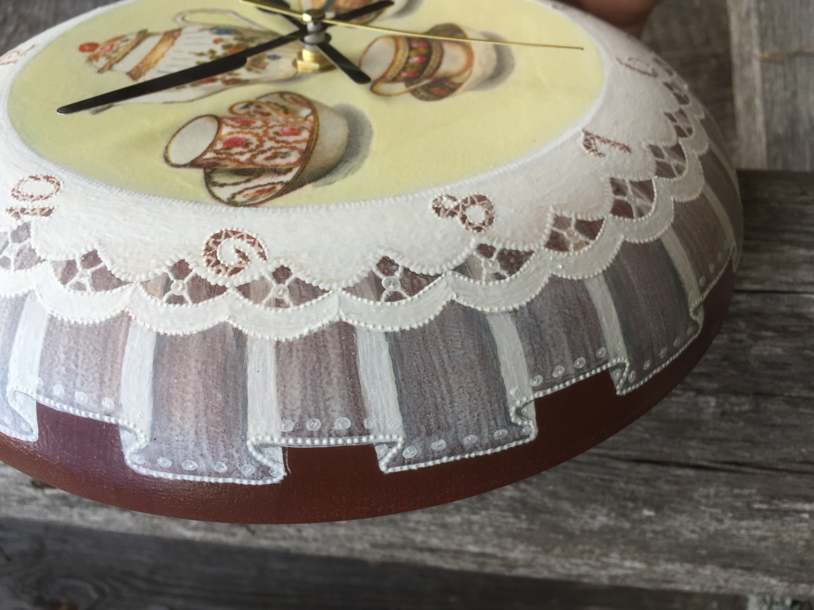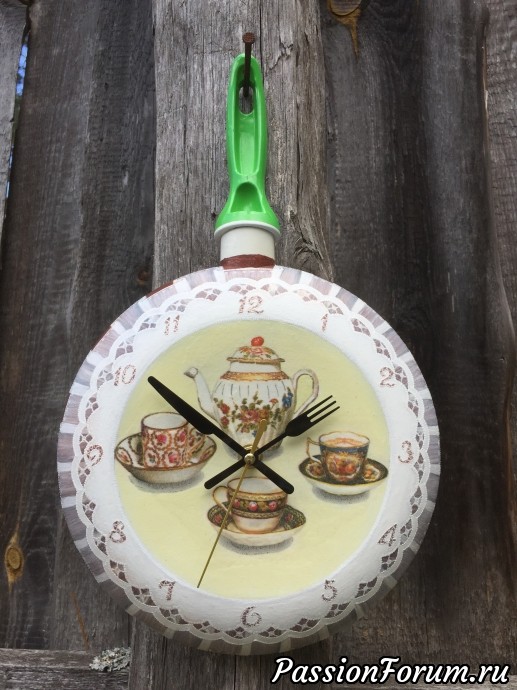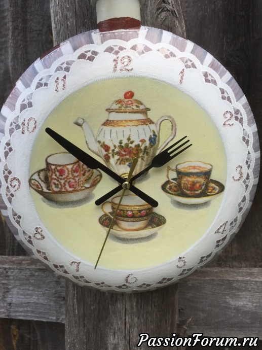 Представляю работу «3 в 1»: давно хотела сделать и часы на сковородке, и с вуалью помучиться, и с ришелье. Недавно кстати купила стрелки подобающие. А тут надо подарочек сделать родне мужа моей сестры, которых не видела сто лет. Думаю, моя задумка кстати.