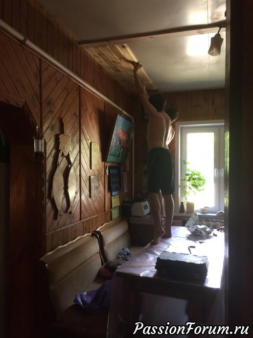 Ну и в довесок - немного деревянного творчества моих мужчин, какие под руку попались папе. Решили в столовой потолок ДВПэшный не красить, а забрать шелёвкой, чтобы гармонировало со стенами. Муж 2 недели её готовил, пазы выбирал, лакировал, а остальное уже под его руководством делали сыновья.