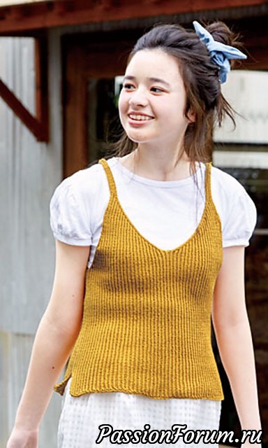 Топик резинкой со скрещенными петлями. Alize cotton gold, спицы №4. Удлинила спинку, хотела чтоб вся пряжа ушла (2 мотка) и все равно остался маленький клубочек. Спицы не стала менять на меньшие для получения А-силуэта, как рекомендовано в инструкции. Описание здесь: ravelry.com/patterns/library/216ss-02-knit-bustier