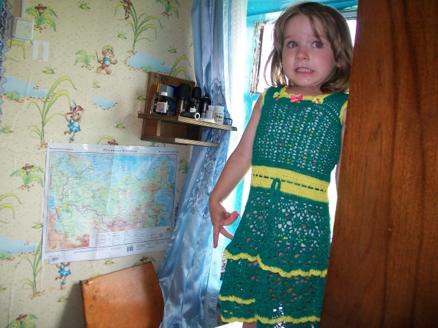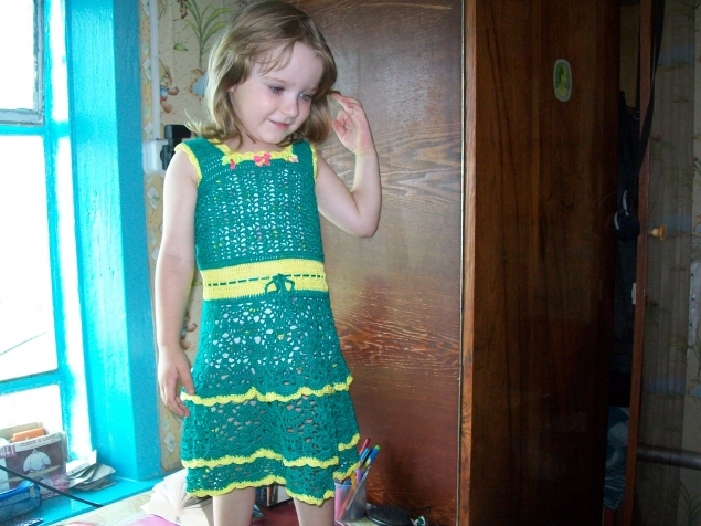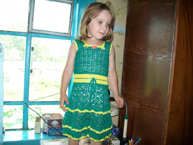 Весёленькое платьице))) Только верх юбочки надо было связать столбиками без накида — по границе трусиков, что бы не просвечивало. Стесняться ведь будет доча.