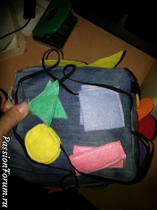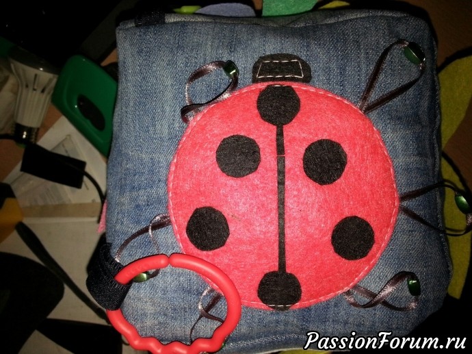 после первой сшитой мной развивашки на подарок,решила попробовать осчастливить сына игрушкой. материалы;джинсы,поролон,фетр,бусины,шнурок,грызунки,тесьма ,резинка,наклейки. грызунки заказывала на Джуме400 рублей за 24 штуки. играть конечно под присмотром ибо грызет все)))))