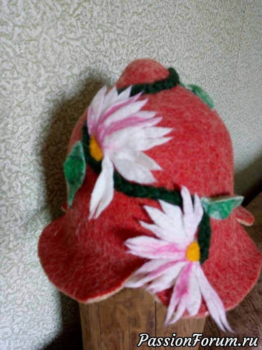 Мой дорогой муж сделал мне самую простую шляпную колодку.И я сразу решила сделать самое что ни наесть простое...банную шапку.Внутренняя часть батист,остальное белый сливер и красная троицкая самая верхняя часть. Цветочки пришивные.