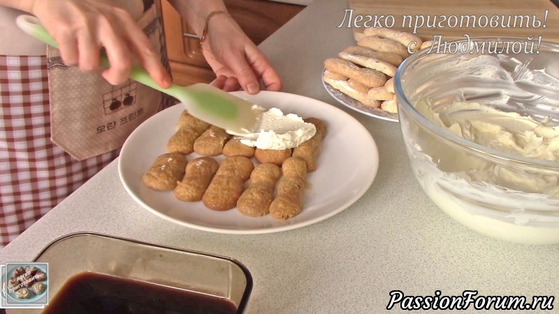 Беру по одному печенью, опускаю его на пару секунд в остывший кофейный раствор и кладу на тарелку, на которой буду собирать торт. Печенье кладу почти вплотную друг к другу, выкладываю ими первый нижний слой.